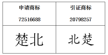申请商标是由“楚-北”两个字构成的纯文字商标,采用简单大气的宋体字书写,给人一目了然之感。引证商标是由“北-楚”两个汉字构成的商标,风格端庄秀丽,字形美观工整。