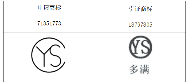 引证商标是由字母图标+汉字构成的组合商标。上方是一个圆形图标,粗狂的线条勾勒呈正圆,中间为两个字母“YS”。下方汉字“多满”采用宋体字。