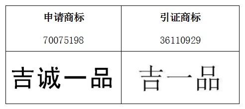 申请商标“吉诚一品”整体表达的含义是:吉林市的诚信一流的生产厂家。引证商标整体表达的含义是:特别吉利的事情。