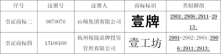 申请商标由图形、汉字、英文呈上中下结构组合而成,图形为一个开口处为龙头的圆形,身体为稻穗,中心处为“壹”;汉字“龙粮壹号”采用毛笔字书写;英文“LONGLIANGYIHAO”由宋体书写,末端有装饰部分。引证商标一是由汉字“壹”构成,整体以长方形为背景,右上角向下延伸一条弧线,汉字由内部镂空而出,采用草书书写。引证商标二是由汉字“壹牌”构成,采用黑体书写。引证商标三是由图形加汉字“壹昊”呈上下结构组合而成,图形由正方形印章章戳为框架,内部为汉字“壹”;汉字“壹昊”采用隶书书写。引证商标四是由汉字“壹工坊”构成,采用宋体字书写。引证商标五是由汉字“壹”加英文“FASHION”呈左右形式组合而成,采用黑体书写。