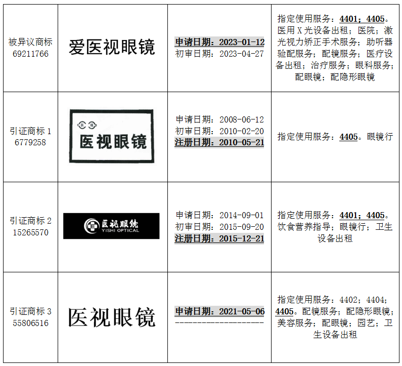 “爱医视眼镜”商标被异议案例。被异议商标与引证商标同为文字商标,我司律师从双方显著性等方面入手,最终确定了双方属于近似商标,成功将“爱医视眼镜”商标异议掉,助异议人维权成功。