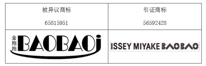 被异议商标是由英文加汉字组合成。商标中含有汉字“金抱抱”,被异议商标中的英文由“BAOBAOJ”构成;而引证商标为纯英文商标,由英文“ISSEY MIYAKE BAOBAO”构成;英文部分“BAOBAO”与被异议商标中的英文部分“BAOBAOJ”构成差异显著,两商标构成方面明显不同。