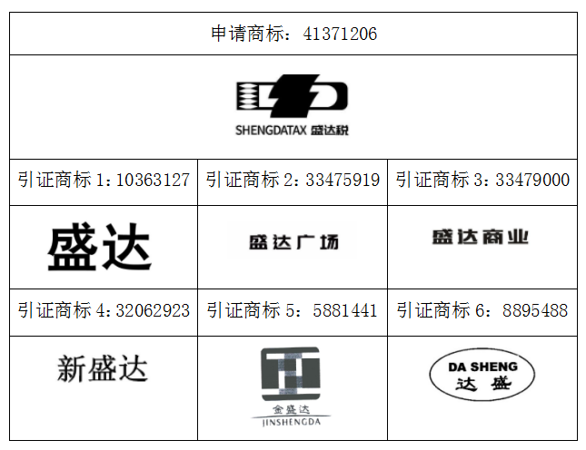 申请商标由图形、英文和汉字构成。图形部分以U盘造型为背景,下方为英文“SHENGDATAX”,右侧为汉字“盛达税”,笔画厚重,强有力度;引证商标1由汉字“盛、达”二字构成。采用黑体书写;引证商标2由汉字“盛、达、广、场”构成。引证商标3由汉字“盛、达、商、业”构成,字形紧聚;引证商标4由汉字“新、盛、达”构成。采用宋体书写;引证商标5由图形、汉字和汉语拼音构成。图形部分采用模块化设计,汉字字形略扁,笔画纤细;引证商标6“”由图形、汉字和汉语拼音构成。商标采用椭圆环为整体框架,内里上方为汉语拼音,下方是采用隶书书写的汉字。