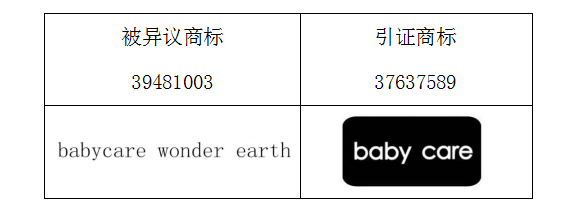 被异议商标是由三个英文单词“babycare wonder earth”构成的英文商标,而引证商标则是由图形和两个英文单词“baby care”构成的组合商标。