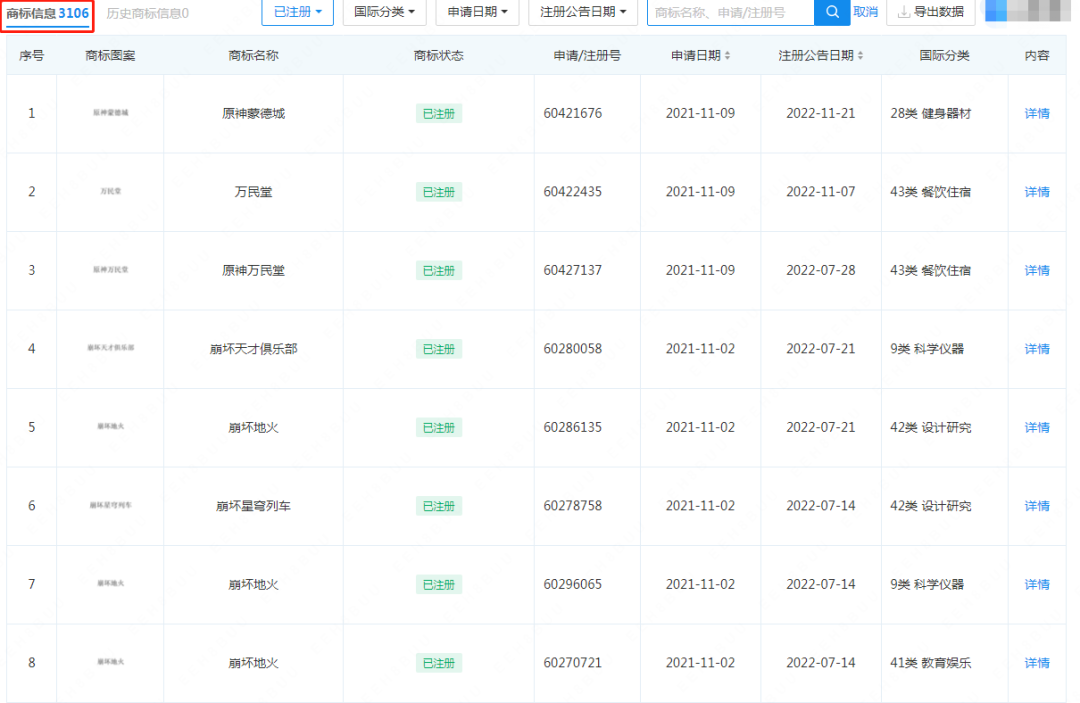 作为一款现象级游戏,在短短的两年间就收获了如此多的荣誉,实属不易,而其背后的米哈游公司除了在技术、游戏玩法等方面远超同行业企业外,在商标布局方面同样一骑绝尘。