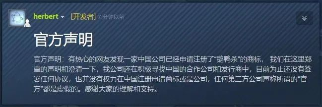 随后,《鹅鸭杀》官方也发布声明回应:有热心的网友发现一家中国公司已经申请注册了“鹅鸭杀”的商标, 我们在这里郑重的声明和澄清一下,我公司还在积极寻找中国的合作公司和发行商中,目前为止还没有签署任何协议,也并没有权力在中国注册申请商标或是公司,任何第三方公司声称所谓的“官方”都是虚假的。感谢大家的理解和支持。