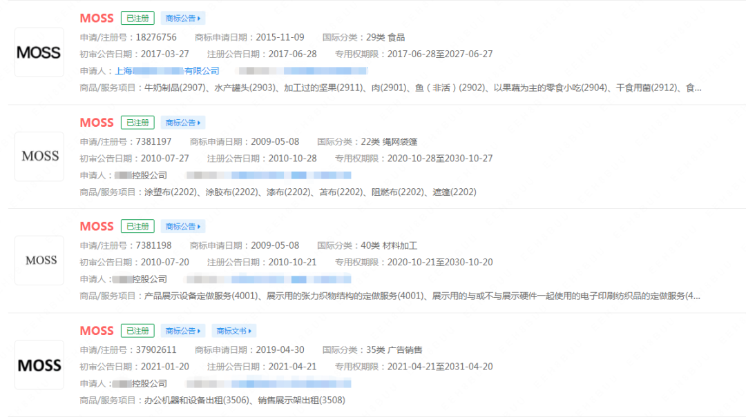 尽管郭帆导演已经尽可能的全面布局商标,但总有落网之鱼。据查询,片中重要元素“MOSS”已被多方注册为商标,申请人包括科技公司、电商公司、传媒公司以及多位自然人,国际分类包括科学仪器、灯具空调、运输贮藏等。而最近的一枚“MOSS”商标是某科技公司申请于2023年1月,国际分类为手工器械,目前商标状态为注册申请中。