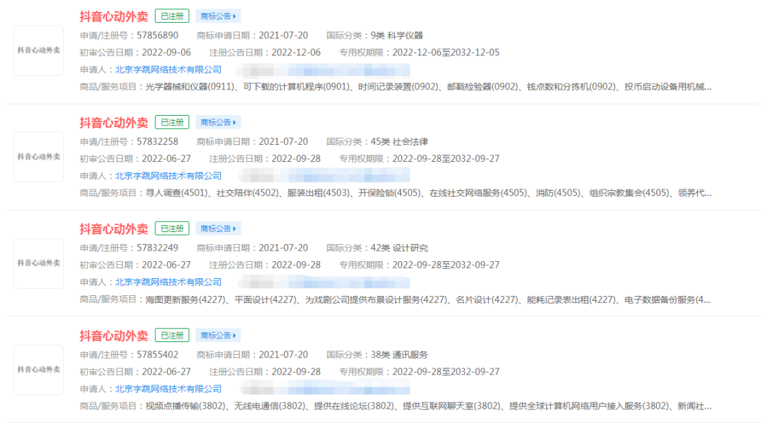 据查询,2021年抖音关联公司北京字跳网络技术有限公司分别申请注册多枚“抖音心动外卖”商标,国际分类包括教育娱乐、通讯服务、社会服务等。以上商标均申请于2021年7月。除此之外,该公司申请的“心动外卖小程序软件”也于2021年10月获得软件著作权登记批准。