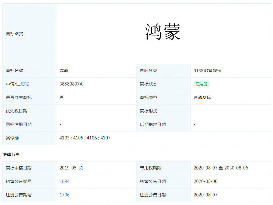 2019年鸿蒙系统被应用在大量的智能手机上市,已经向相关的部门进行报备,选择的分类是42类,但惨遭驳回。之所以出现这种情况,是因为已经有相似的商标进行注册。
