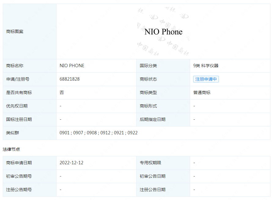 据查询,蔚来已于2022年12月12日在第九类商品服务上申请注册了“NIO PHONE”商标,目前处于注册申请中。