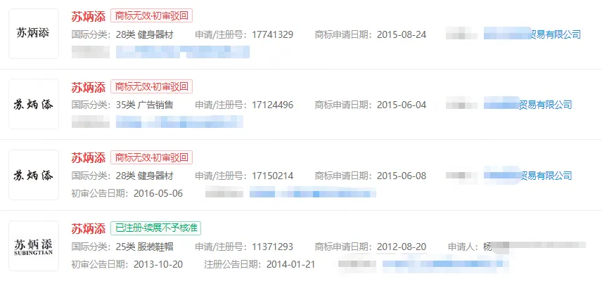赛场之外,近年来,苏炳添聚焦短跑的学术研究和教学工作。2018年,他开始担任暨南大学体育学院副教授,后受聘为教授,今年4月被任命为暨南大学体育学院院长。10月,苏炳添速度研究与训练中心启用,他希望把个人奋斗延续为团队探索,助力中国短跑的人才选拔和培养。苏炳添作为亚洲田径赛场上的传奇,曾经的光辉历史,让他一时间成为了“体育网红”,为此收获了诸多流量。但这流量的背后却是数不清的“侵权”。律师通过查询了解到,“苏神 苏炳添”的姓名曾被某企业以及个人申请注册为商标,国际分类包括健身器材、广告销售、服装鞋帽,一共4枚商标,不过其中三枚已在初审时被驳回,而另一枚虽然注册成功,但却在2022年1月被成功无效,也就是说这些商标均属于无效状态。除此之外,还有多家企业申请注册“苏炳添”姓名的近似商标,包括“速炳添、苏饼添、炳添、酥饼添、苏丙天”等,国际分类更是涉及医药、餐饮住宿、方便食品等多个类别,目前部分已注册成功,部分则是在初审时就被驳回,属于无效状态。这种商标申请行为,往往都会在初审时就被驳回,有少部分可能会侥幸注册成功,但要记住的是,侥幸的注册成功并不代表万事大吉,在日后商业使用上一旦被注意到,侵权行为成立后,不仅商标会被无效,还可能需要公开道歉、赔偿损失并承担一定的法律责任等都是有可能的。而你的“山寨品牌”更会在商业市场上消失的无影无踪,这个时候不仅自己的名誉、信誉以及前期付出的费用付诸东流以外,还可能需要“倒贴”。因此,对于企业或者商家来说,想要在激烈的商业竞争中生存,永远不是榜傍名牌、蹭蹭流量就可以做到的,唯有专心研发,做好自身产品质量的,才能得到消费者的信任。