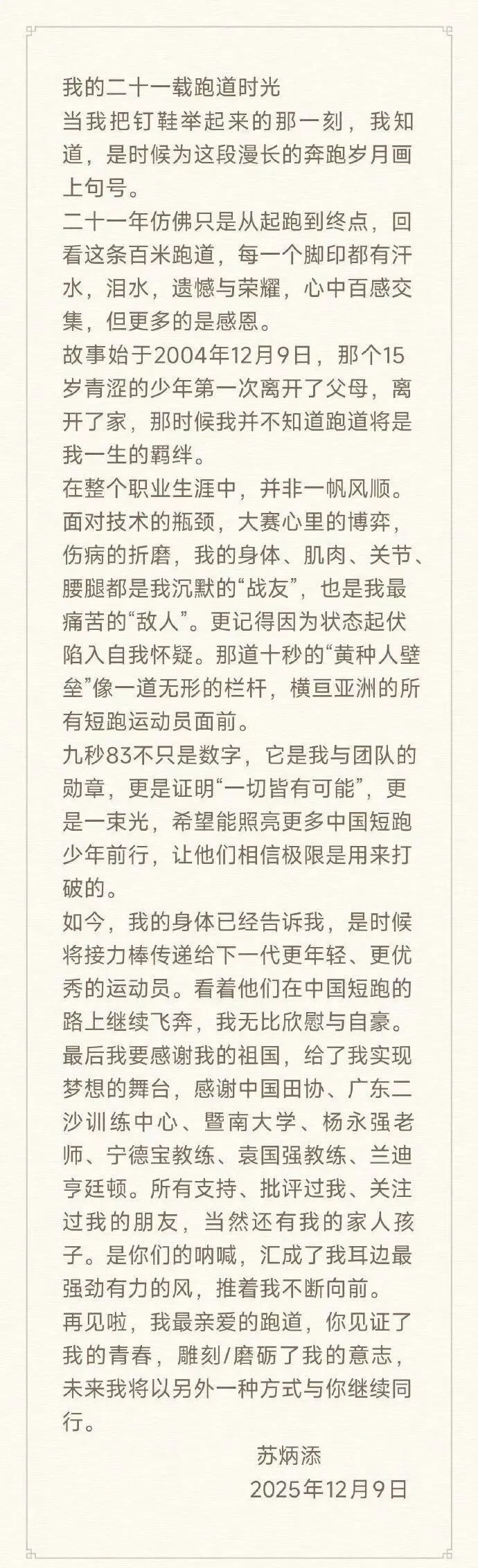 苏炳添在个人微博上发表了一篇题为《我的二十一载跑道时光》的文章。文章写道:“当我把钉鞋举起来的那一刻,我知道,是时候为这段漫长的奔跑岁月画上句号。二十一年仿佛只是从起跑到终点,回看这条百米跑道,每一个脚印都有汗水,泪水,遗憾与荣耀,心中百感交集,但更多的是感恩。故事始于2004年12月9日,那个15岁青涩的少年第一次离开了父母,离开了家,那时候我并不知道跑道将是我一生的羁绊。”