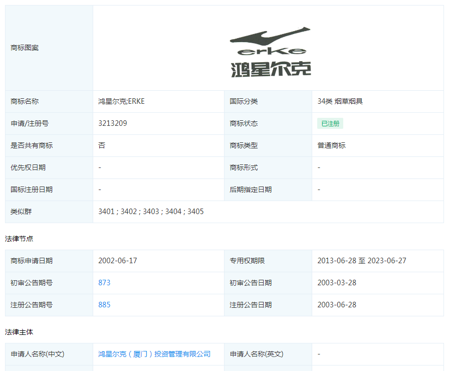 鸿星尔克成立于2000年,截至目前,已经成功注册了超一千件商标。其中“鸿星尔克”文字商标,“ERKE”字母商标,以及鸿星尔克标志logo商标,都在45个类别上做了全面覆盖注册。