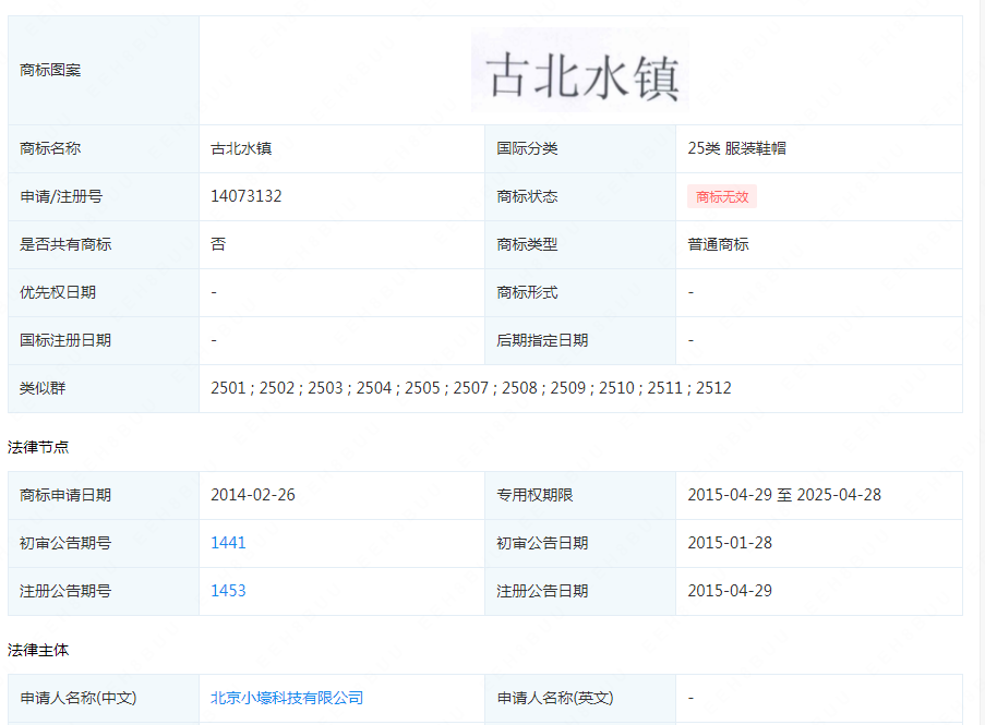 古北水镇公司于2010年7月在密云区注册,专为运营古北水镇景区设立;小壕科技公司于2014年2月也在密云区注册成立。2014年2月26日,小壕公司提交了两件“古北水镇”商标的注册申请。随后,小壕公司向古北水镇提起侵权投诉。