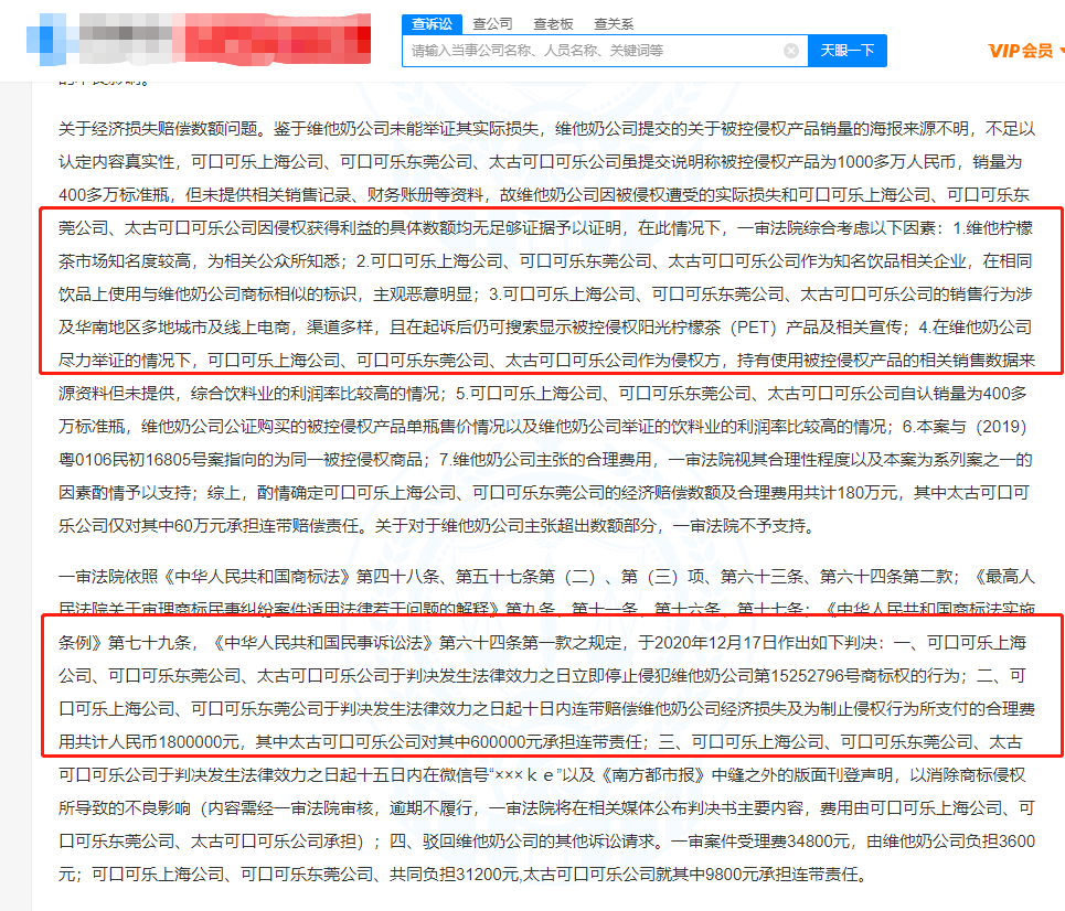 一审认为,被控侵权阳光柠檬茶产品使用的柠檬片图案与维他奶公司的维他柠檬茶相关商标构成相似,可口可乐三公司作为知名饮品相关企业,在相同饮品上使用与维他奶公司商标相似的标识,主观恶意明显。最终判决:可口可乐上海公司、东莞公司赔偿维他奶公司180万元,太古可口可乐公司对其中60万元承担连带责任。可口可乐三公司不服判决,遂提出上诉。