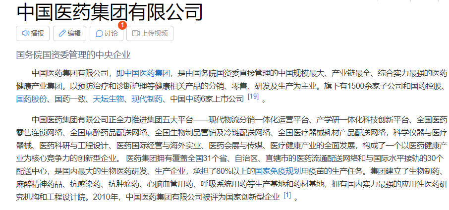 那么,国药集团、中国生物呢?百度百科资料显示,国药集团是由国资委直接管理的我国规模最大、产业链最全、综合实力最强的医药健康产业集团。