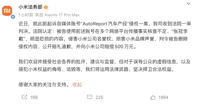 2月24日,小米法务部发文称,就此前起诉自媒体账号“AutoReport汽车产经”侵权一案,近日小米公司收到法院一审判决。