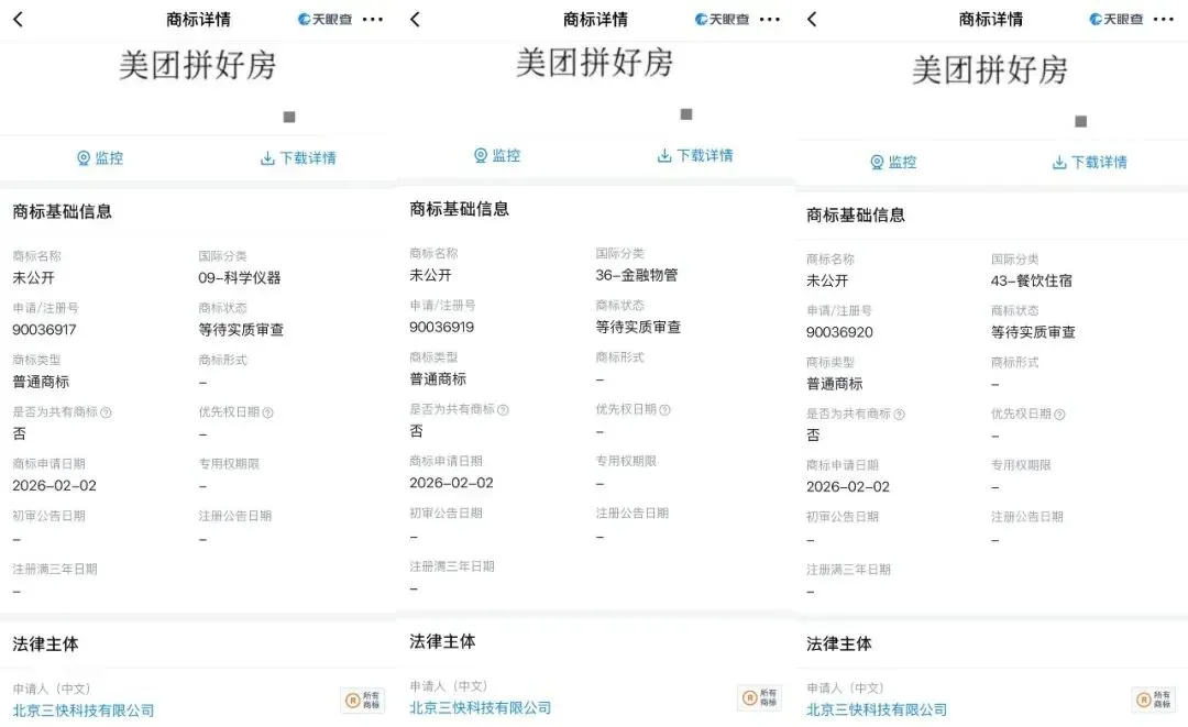 在外卖、酒旅、本地生活领域站稳脚跟的美团,这次要进入房产赛道了?据公开资料显示,近日,美团关联公司北京三快科技有限公司申请注册3枚“美团拼好房”商标,国际分类为科学仪器、金融物管、餐饮住宿,当前商标状态均为等待实质审查。