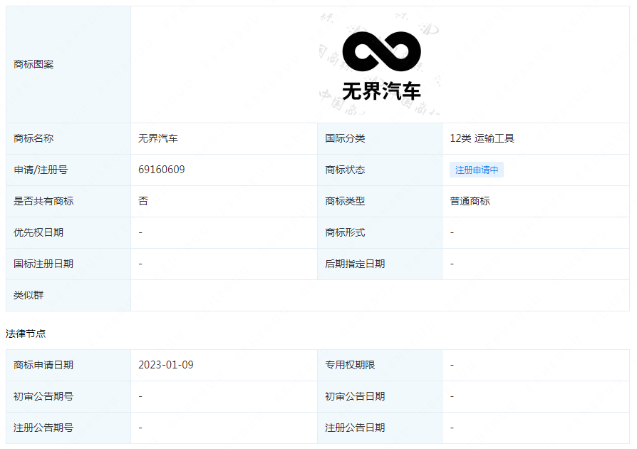根据最新消息显示,魅族的汽车业务布局进展神速,目前珠海市魅族科技有限公司申请注册2枚“无界汽车”商标,国际分类均为运输工具,当前商标状态为申请中。