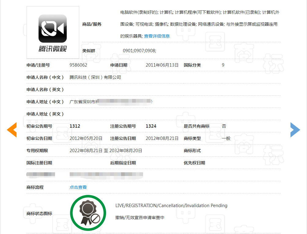 腾讯公司于2011年曾申请了“腾讯微视”等系列商标,注册在第9类-科学仪器这一核心类别。然而,腾讯“微视”系列商标遭遇了无效宣告。